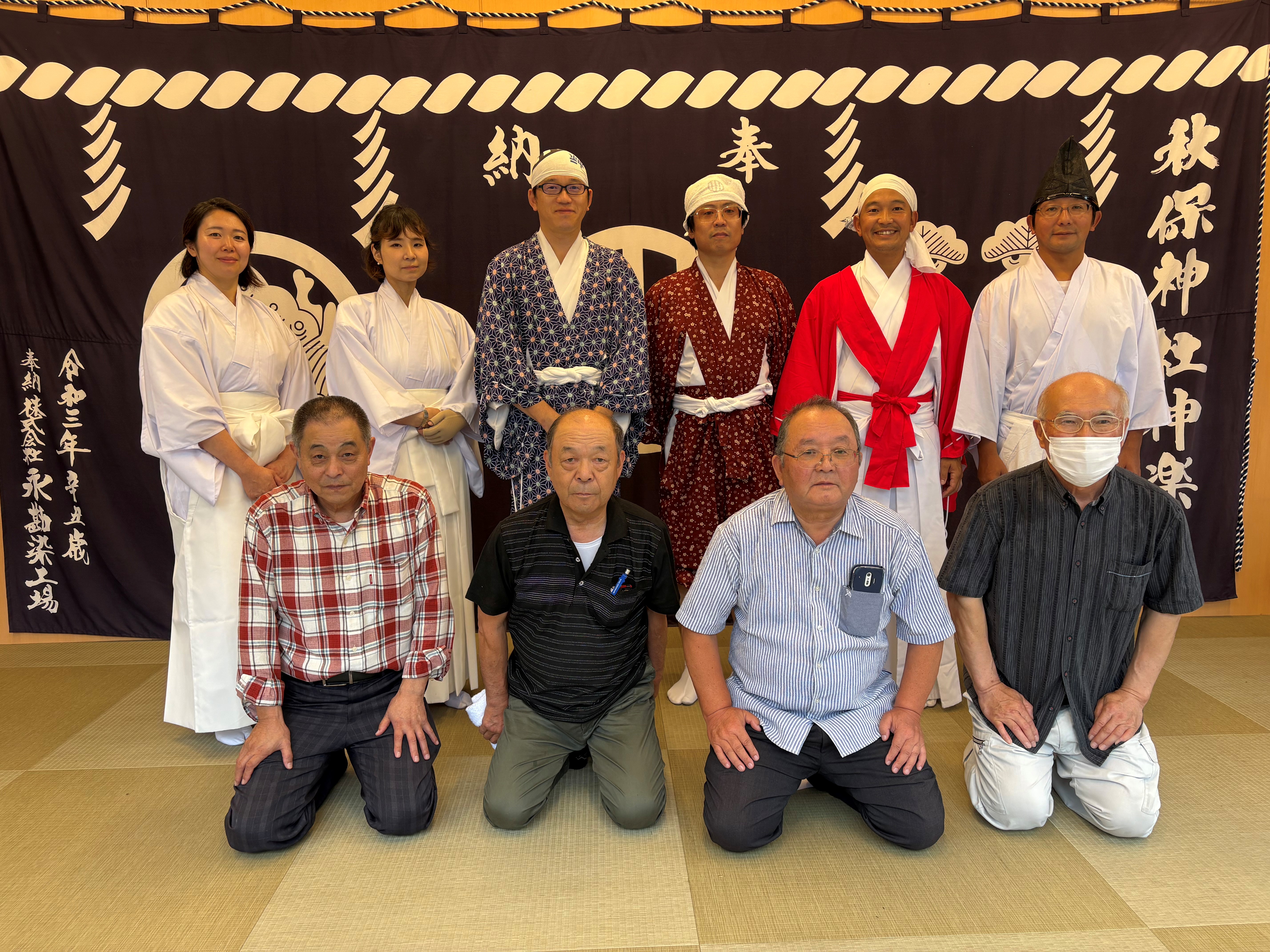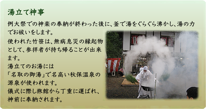 当神社の神楽は、400年以上の歴史があると伝えられております。 (神社に伝わる「別当系図」(べっとうけいず)にて) 演舞は例大祭の一日目に行います。また例大祭での神楽奉納の後、湯立て神事が執り行われます。 また1月14日の夜、神前で年始めの奉納演舞があります。 演目は法印神楽の舞を主としており、一部に熊野堂系の舞曲を含め、 舞型には修験の呪を多く用いております。