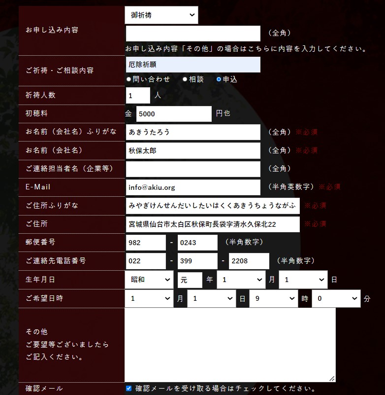 御祈祷、出張祭典のご相談とお申込みをお受け致しております。 ご希望の方は下記記入欄にご記入の上お申し込みください。