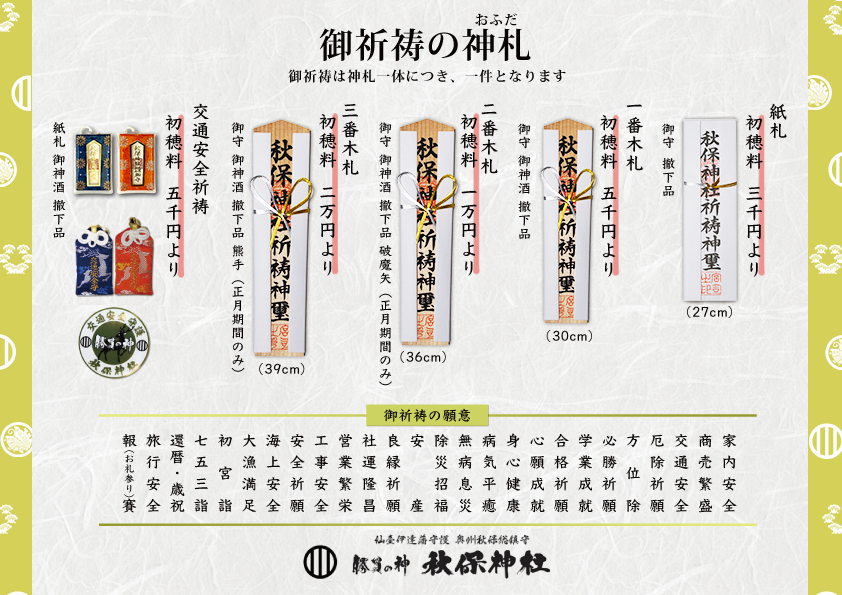 秋保神社では、厄除、交通安全、初宮詣、七五三詣、家内安全、合格祈願、学業成就、必勝祈願、商売繁盛等の御祈祷をご奉仕致しております。