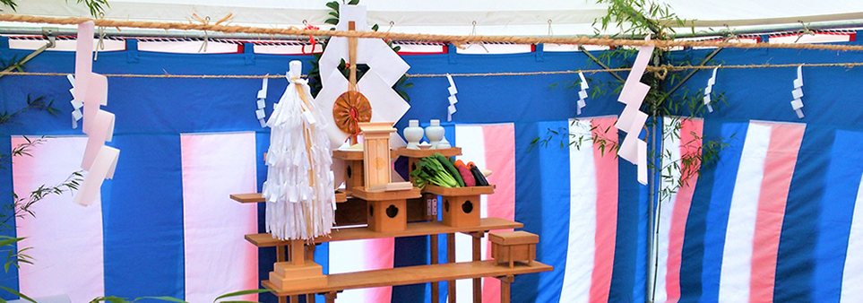地鎮祭 ・ 起工式 ・ 上棟祭 ・ 新宅清祓 ・ 竣工式 ・ 神棚祭 ・ 解体清祓 ・ 井戸埋祭 ・ 開通式 ・ 創立記念祭 ・ 除幕式 ・ 事故清祓式 ・ 慰霊祭 ・ 開店清祓 ・ 工事安全祈願祭 ・ 神葬祭 ・ 御霊祭 ・ 氏神祭 ・ 奉鎮祭 ・ 還暦年祝など その他諸祭典